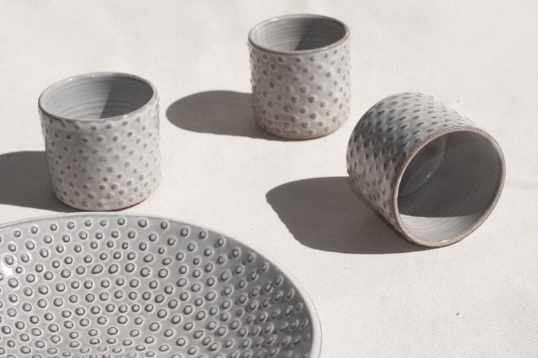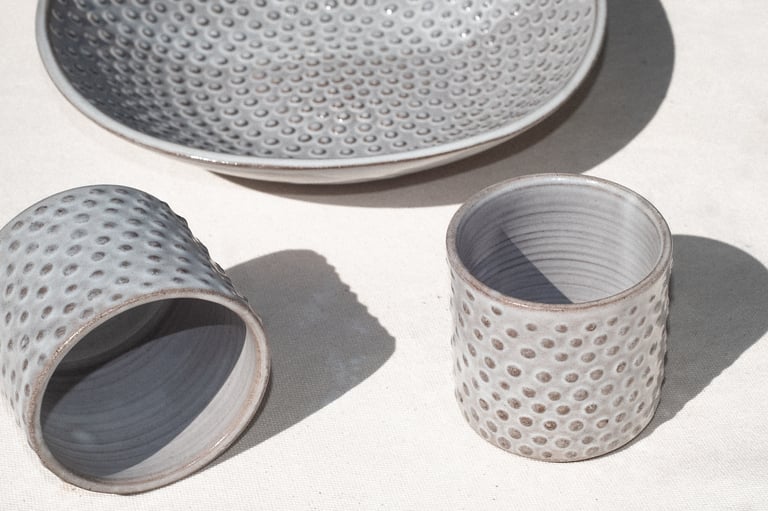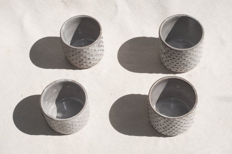Thin textured tumbler with a glossy, almost satin, white semitransparent glaze that breaks to show the dark red clay below.